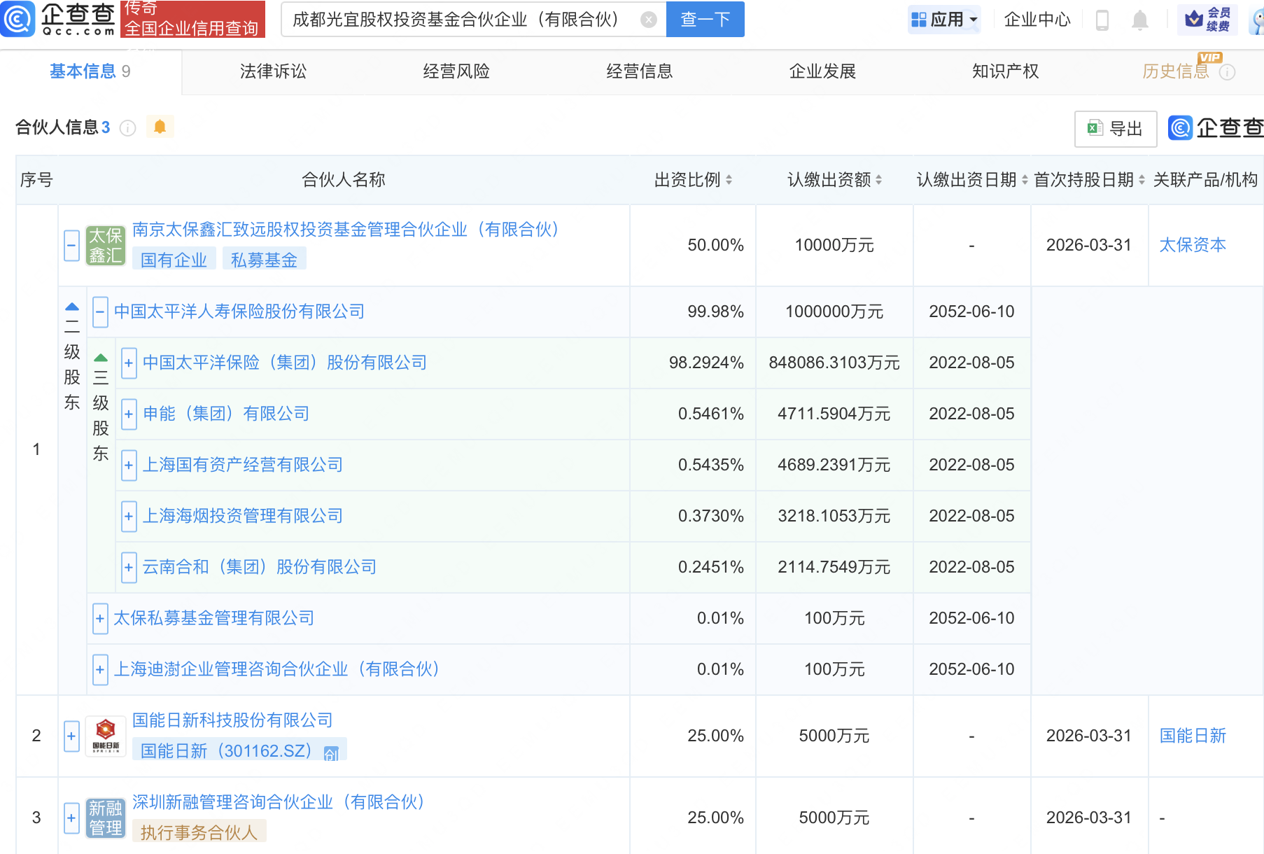 近日,成都光宜股权投资基金合伙企业(有限合伙)成立,出资额2亿元,经营范围包含:以私募基金从事股权投资、投资管理、资产管理等活动。企查查股权穿透显示,该企业由中国太保(601601)旗下南京太保鑫汇致远股权投资基金管理合伙企业(有限合伙)、国能日新(301162)等共同出资。